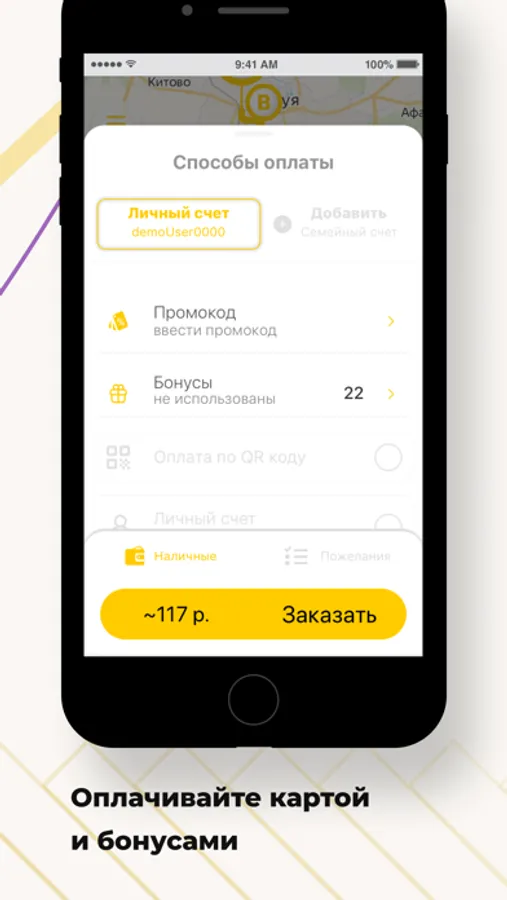 Оплачивайте поездки картой — быстро и безопасно. Чтобы добавить карту, внесите её данные в приложение. Также вы можете оплатить поездку через любое банковское приложение по QR-коду.