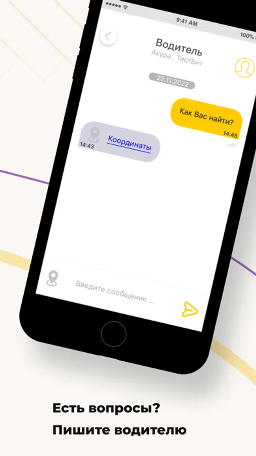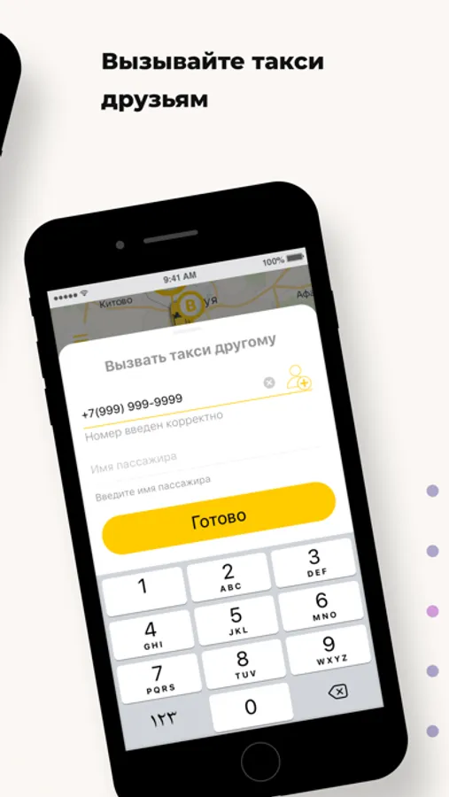 Используйте опцию “Вызвать такси другому” в разделе “Пожелания” и укажите его номер телефона. Когда такси подъедет, на указанный номер придет СМС, а вам — сообщение в приложении.