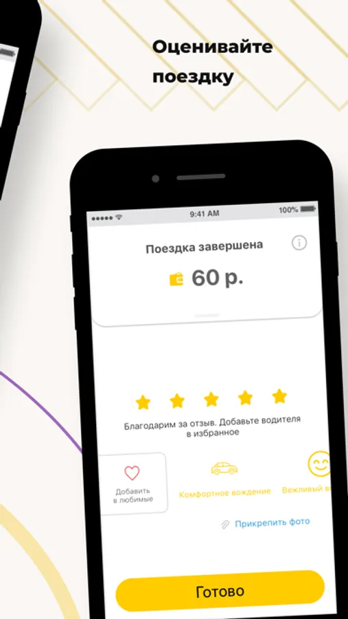 Поставьте оценку водителю, напишите отзыв или выберите реакцию из готовых шаблонов. Прикрепите фотографию к отзыву или посмотрите детализацию платежей после поездки.