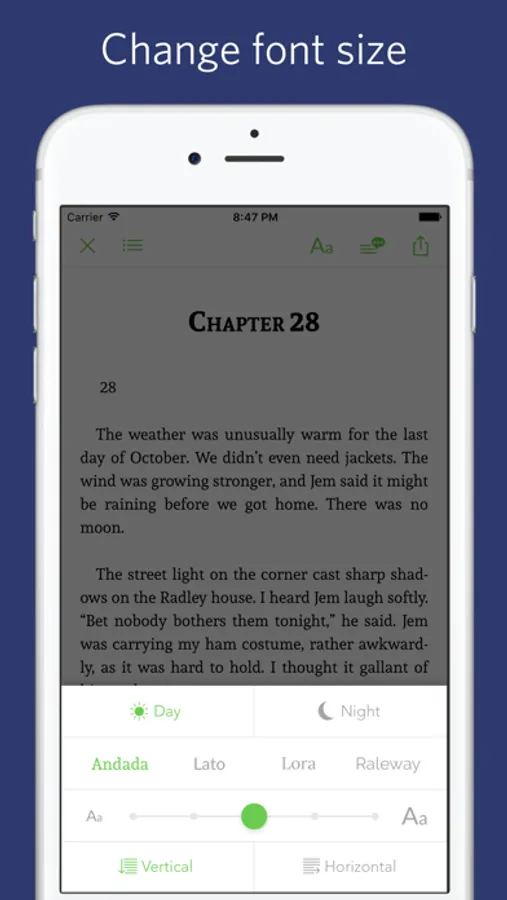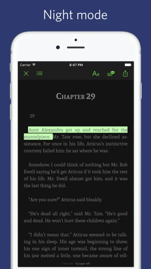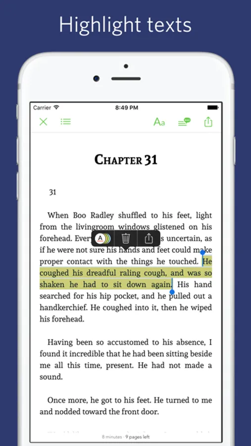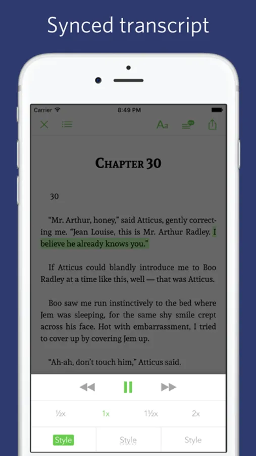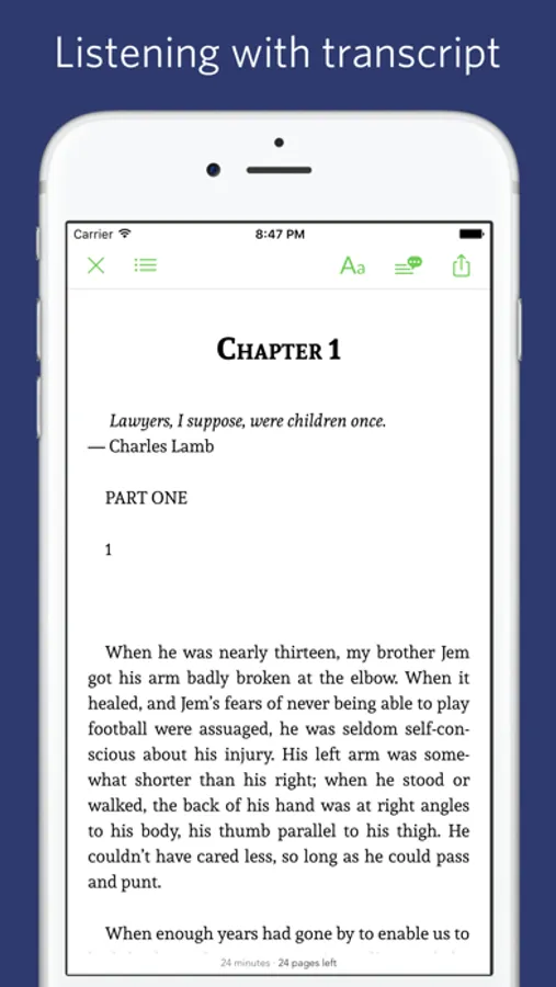 This app combines the novel "To kill a mockingbird" by Harper Lee, with professional narration enabling advanced functions like sync transcript, read aloud (a professional narration synchronized with the highlighted text.)