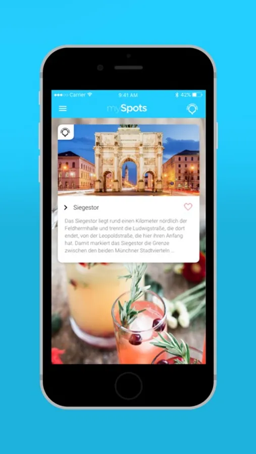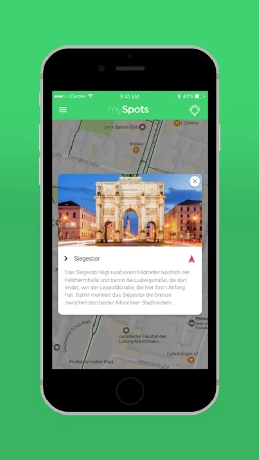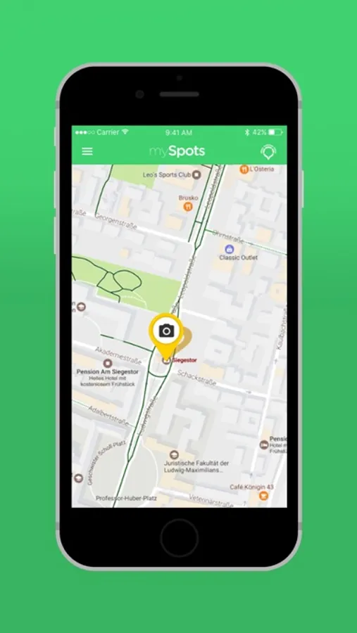 In der mySpots Map siehst du alle Spots um dich herum. Blende über das Menü die Spots aus, die dich nicht interessieren. Finde Sehenswürdigkeiten, Shops, Restaurant, Cafés, Immobilien, Dienstleistungen und vieles mehr vor Ort. Lass' dich mit der praktischen Navigationsfunktion direkt zu Spots navigieren, die dich interessieren.