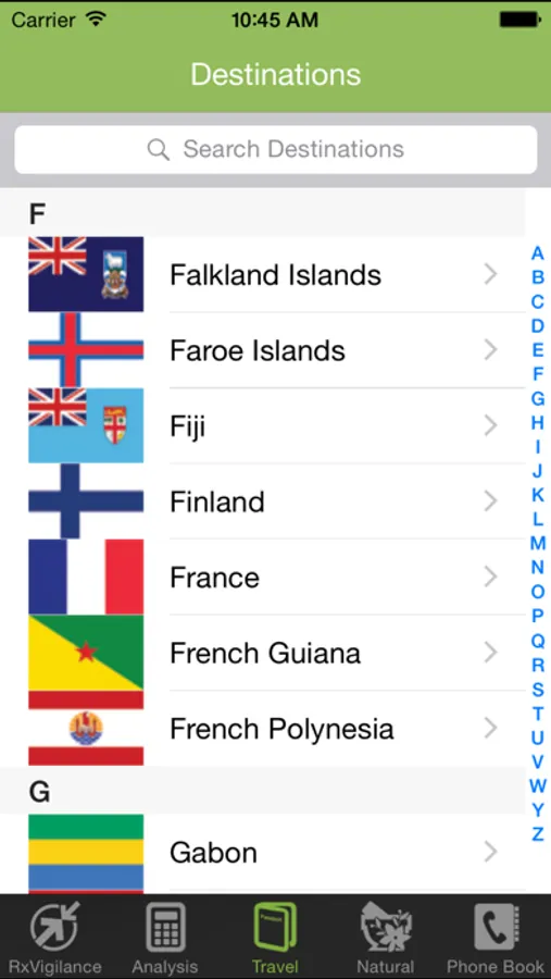 This feature allows to search for over 200 destinations. It provides access to brief and relevant overview of the destination (currency, languages, population, capital), required and/or recommended immunizations by country, recommendations based on diseases found in each country and contact details for service centres that may be of use while traveling.