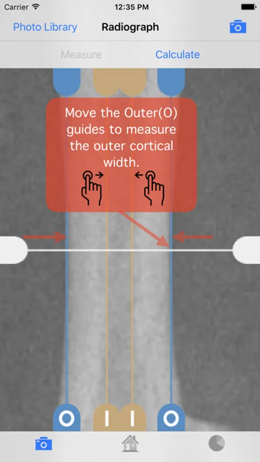 BoneGauge allows you to approximate an individual's bone density and quality from a mobile platform. BoneGauge helps you make measurements of cortical thickness of the second metacarpal from either hand or wrist x-rays. Use your smart phone camera to take a photo of the second metacarpal on an x-ray, or make measurements from an image saved in your photo library.
