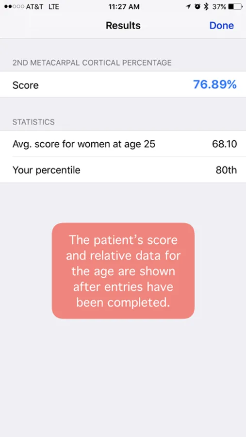 BoneGauge accurately calculates 2nd metacarpal cortical percentage (2MCP) in a semi-automated fashion. 2MCP has been shown to correlate with hip bone mineral density and T scores from DXA scans. Measurements made in the app will be uploaded to a central database. When combined with a patient's age, gender, and DXA score, past measurements will also help the improve the accuracy of future measurements.