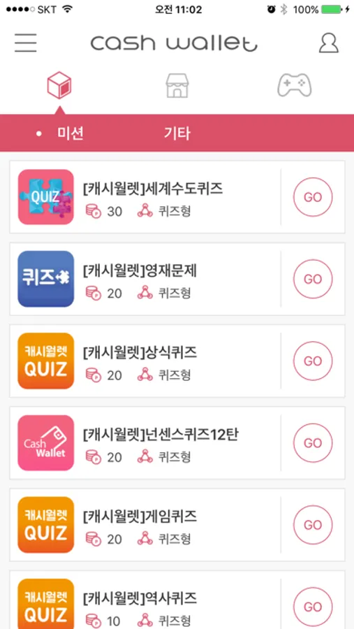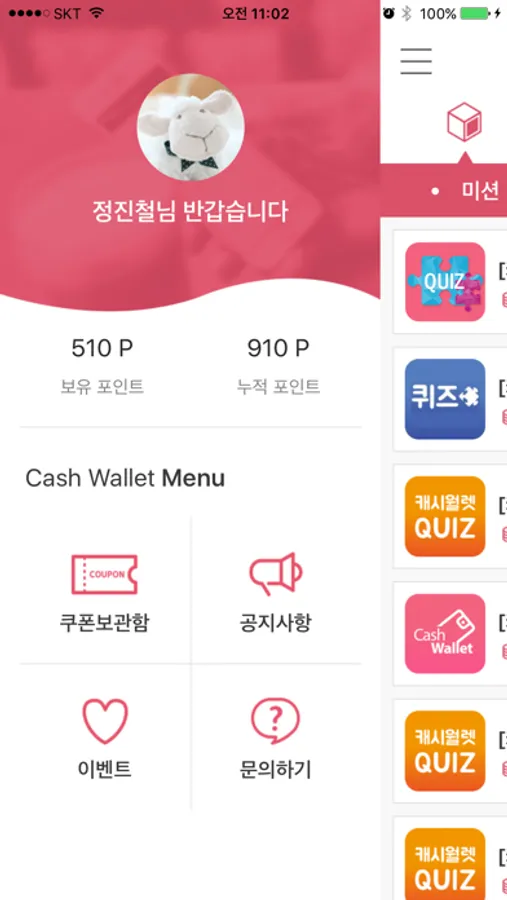 각종 퀴즈와 미션을 완료 후 포인트 획득!