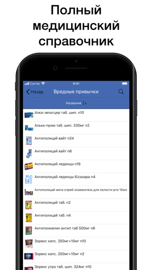 Полный медицинский справочник - надежный и незаменимый помощник при выборе лекарств. Вы сможете быстро и удобно найти необходимое лекарство, прочесть противопоказания и способы применения. Идеально подойдет для людей, которые постоянно в движении. Кроме того, пользуясь медицинским справочником вы не только узнаете полный список симптомов интересующего вас недуга, но и врача, который поможет вам в решении вопроса.