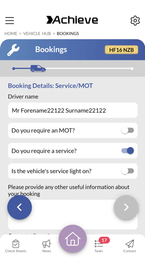 This function allows you to select a booking type; service, MOT or tyres. You will be presented with your current vehicle's registration, contact number and current recorded mileage. You will then be directed to complete your booking requirements. You can then submit your booking request.