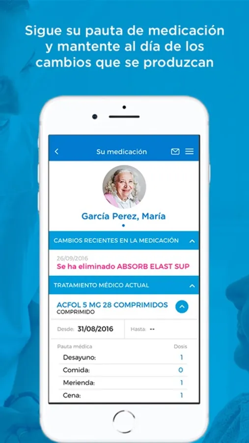 • Accederás a toda la pauta médica de tu familiar, viendo destacados los cambios recientes y pudiendo contactar directamente con el equipo médico del centro para que te resuelvan tus dudas.