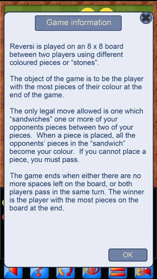 Theole is the classic strategy board game of territorial occupation involving placement & capture of game pieces and has been a favourite with board gamers for many years. Theole is played on an 8 x 8 board between two opponents using different coloured pieces or "stones". The object of the game is to be the player with the most pieces of their colour at the end of the game.