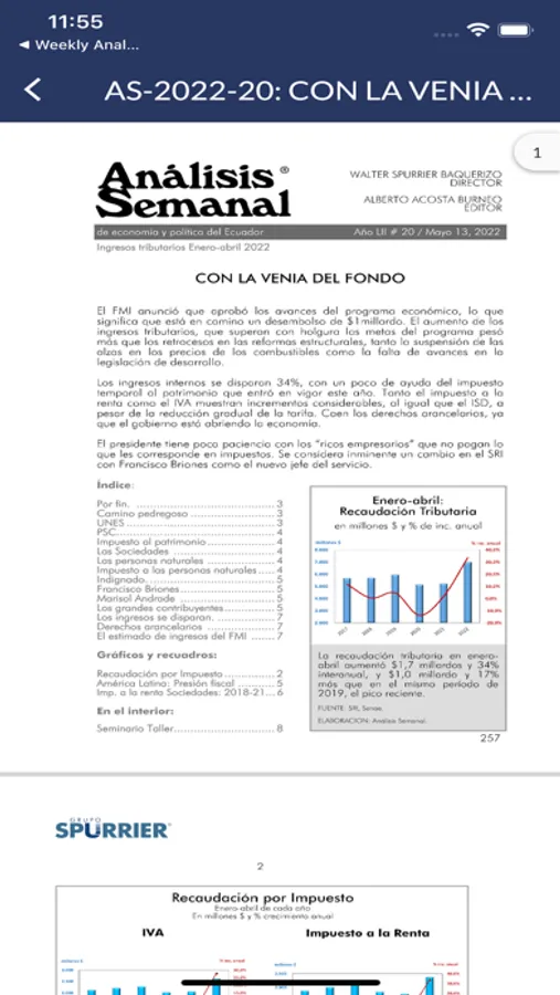 Informe del Grupo Spurrier fundado en 1970 por Walter Spurrier, que ha asesorado por más de 35 años a empresas, organizaciones sociales, grupos de relaciones públicas, estudios jurídicos y agencias de gobierno, en la toma de decisiones económicas y políticas a través de su Análisis Semanal. Su Director es Walter Spurrier Baquerizo y su Editor es Alberto Acosta Burneo.