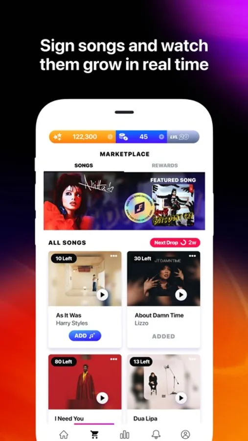 ▶ SIGN HIT SONGS — each week your goal is to earn as many plays as possible (combined stream totals from Spotify, Apple Music, Tidal, Amazon Music, etc) on the songs you’ve signed to your label. By earning plays on your songs, you’ll rank up and earn different rewards: from Silver, Gold, to Platinum.