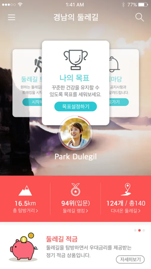 트레킹 거리에 따른 우대금리가 적용되는 금융권 최초 트레킹 연계 BM특허를 획득한 서비스입니다.