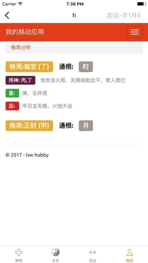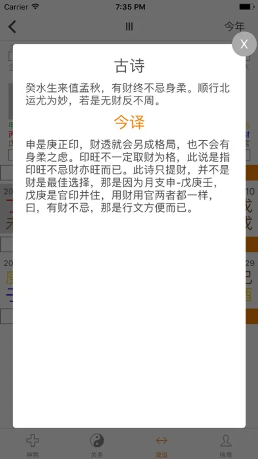 《金不换大运》《天元巫咸经》的深入研究,特此开发一款便于专业人士分析和业余人是学习的App,2.0版会提供有关“格局”,“用神喜忌”,等对专业人士和业余人士学习的多项帮助功能,敬请留意。