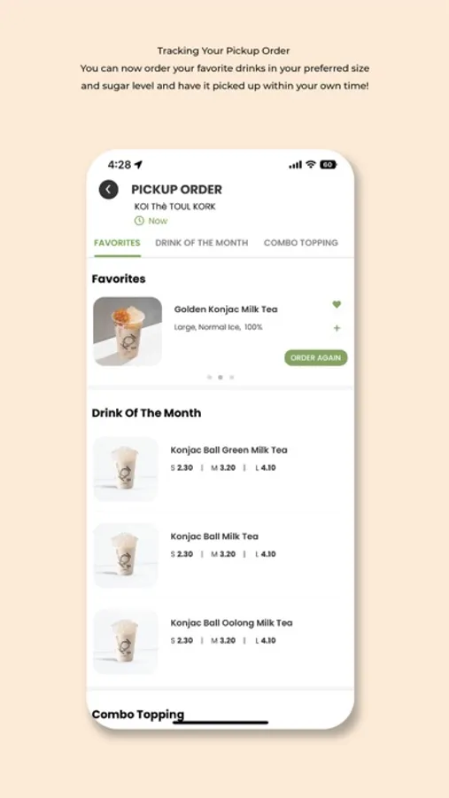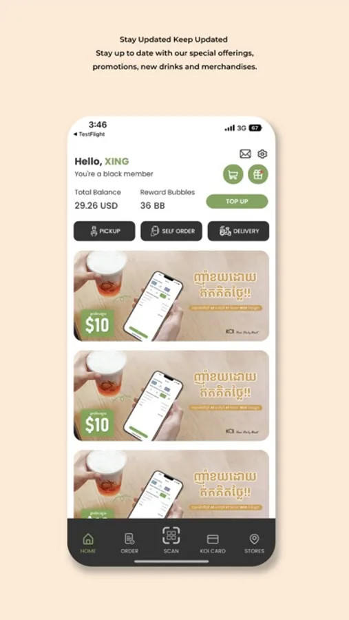 KOI Thé Mobile Application is an app that links the customers' interest to our beverages. They will be able to receive every sort of our information quickly through their smartphones. It is also to link the membership cards as it allows the users to check their Reward Bubbles, Membership Points, Menu, Location, Outlets (In Cambodia ONLY), and various promotions.