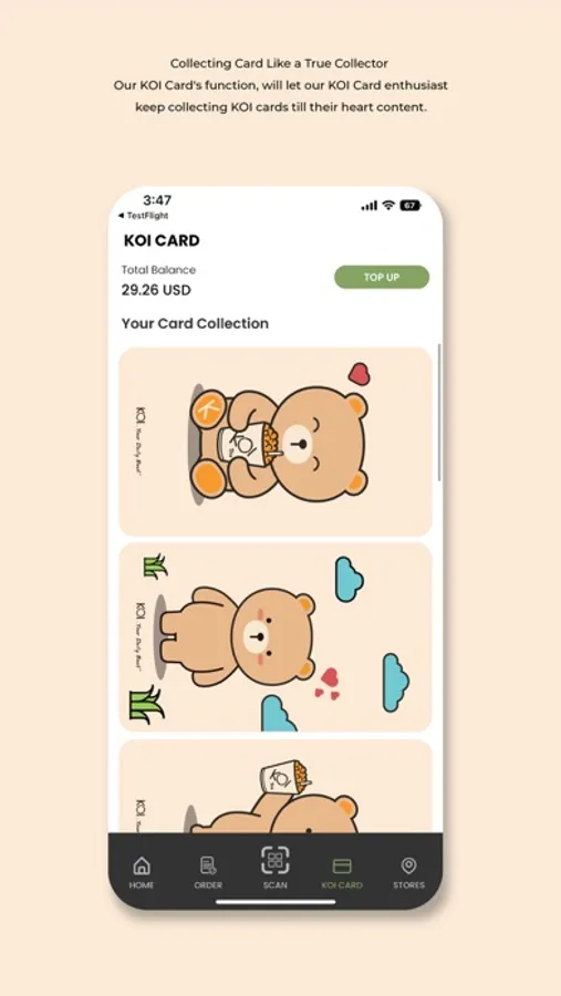 Additionally, it allows the users to view their own transactions on making purchases at KOI. Users will be able to make purchases not only by cash, but they will be able to purchase through their card(s) or their smartphones by registering their membership cards with the app. With the current situation of the pandemic, we also release Pick Up and Self Order functions, in which they can do online ordering to purchases their favorite drink, and no need to queue.