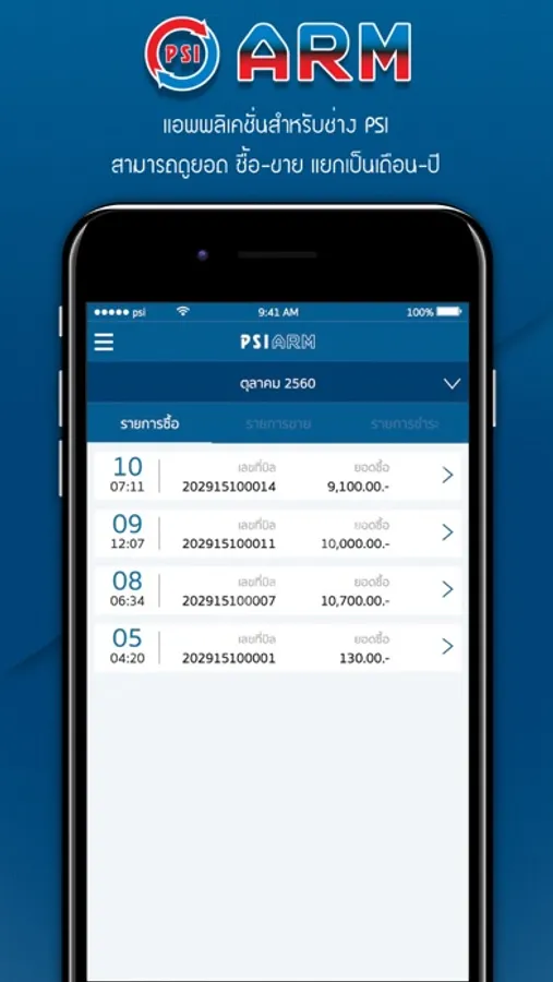 PSI Arm แอพพลิเคชั่นที่รวบรวมข้อมูลรายละเอียดรายการซื้อ-ขาย, ยอดที่ต้องชำระ, กำหนดการชำระของช่างและโปรโมชั่นต่างๆ รวบรวมไว้ครบภายในแอพพลิเคชั่นเดียว