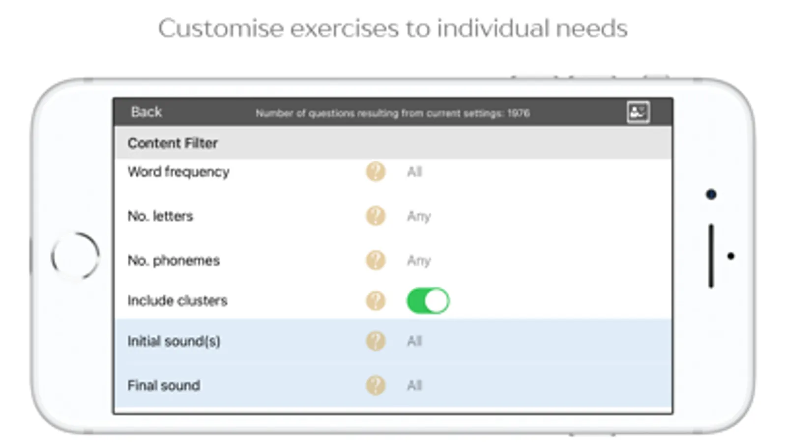 Cuespeak is optimised for use with a Speech & Language Therapist, but can also be used independently. The app can be managed remotely from another location, with the clinician or other helper sending session updates via the internet, and the user sending back results. An advanced settings menu allows SLTs to tailor exercises for very specific linguistic needs. Target words can be selected according to number of phonemes (sounds), number of letters, number of syllables, first and last sounds, grammatical word class and thematic role. The app contains a library of video tutorials to guide the customisation process.