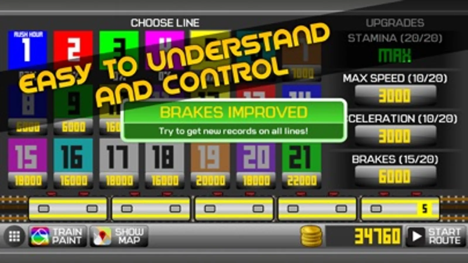 - Upgrade the maximal speed, acceleration, and brakes of your trains to progress faster