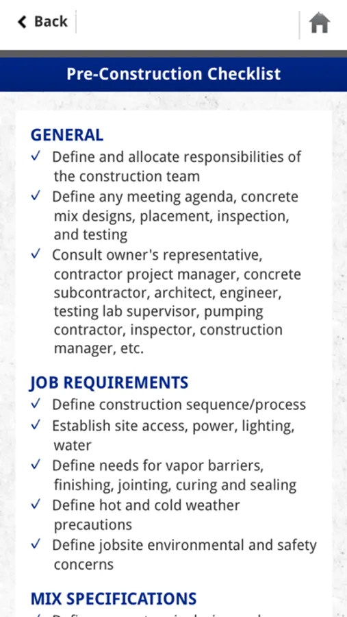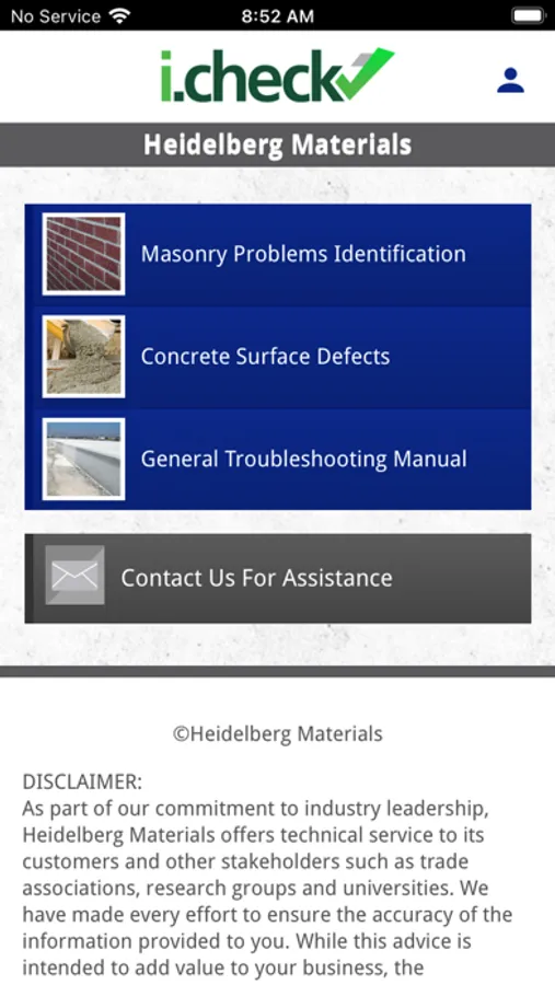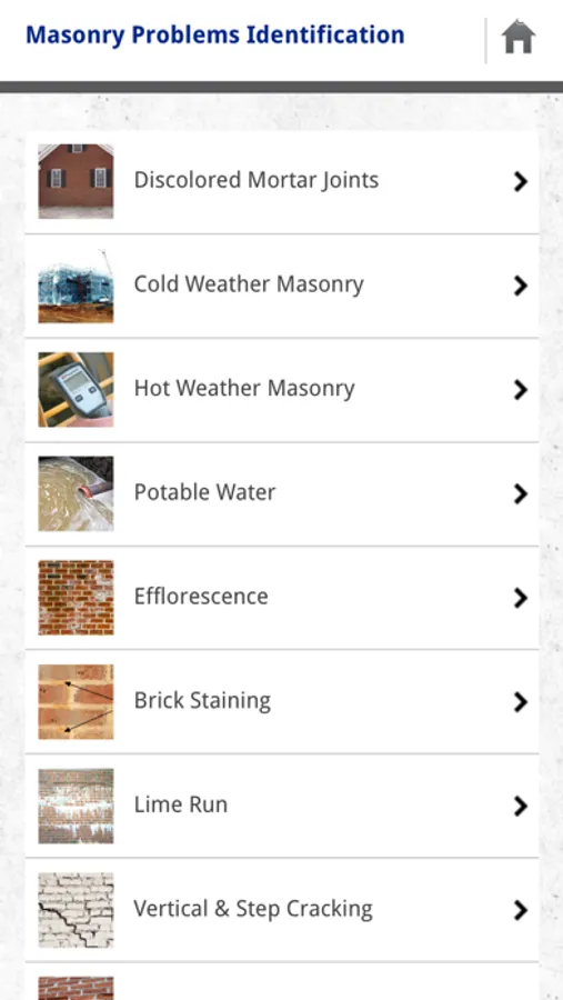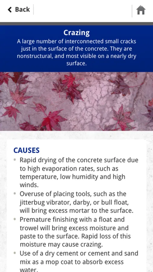 iCheck provides photos of common issues in concrete and masonry applications. Each photo is complemented with a listing of potential causes, and detailed corrective actions to alleviate the problem.