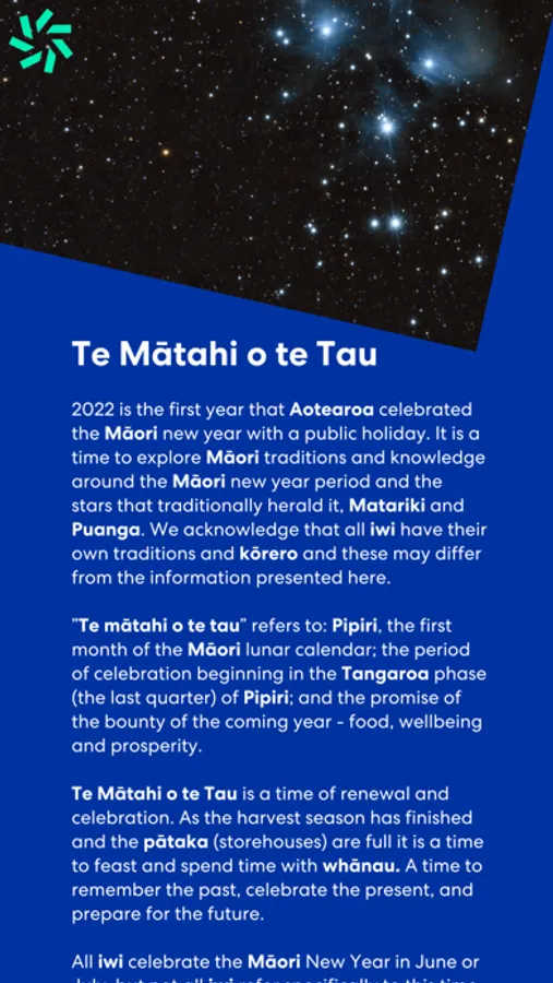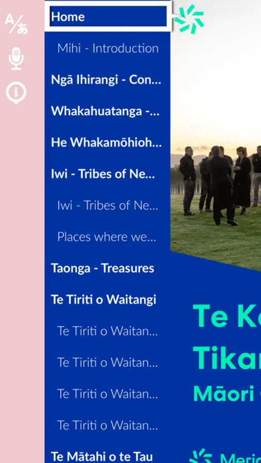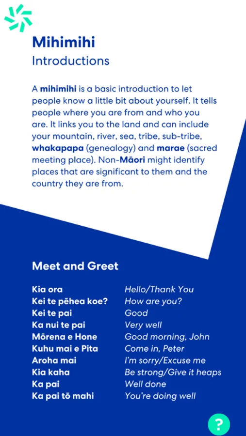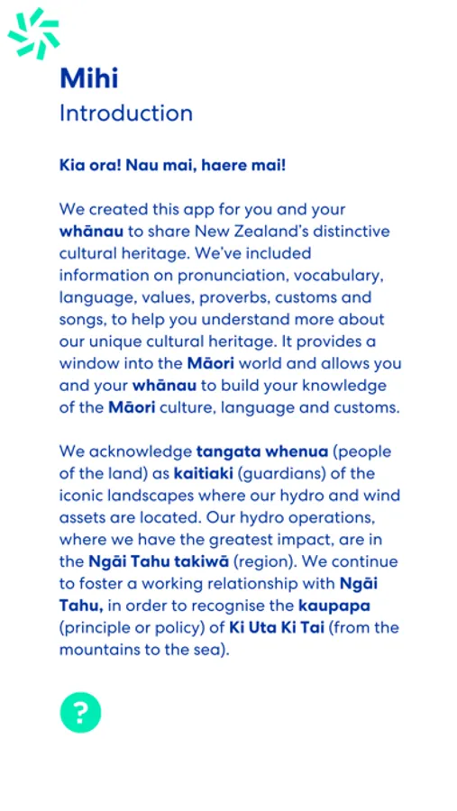 Interactive features within the app include pronunciation of Māori words, maps with Māori names and iwi groups, values and principles, mihimihi/pepeha (introductions), ngā mihi (greetings), poroporoaki (farewells), whakataukī (proverbs) and waiata (songs).