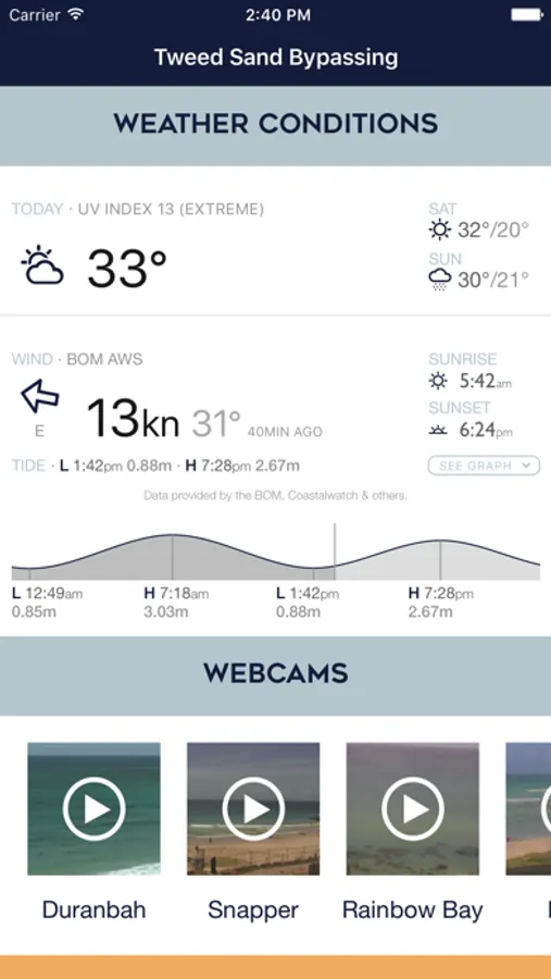 Using up-to-date BoM data, view the current weather conditions including forecasts, winds and tides.