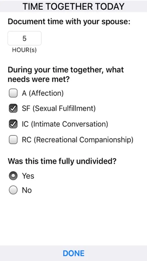 Solution...this app helps you record your undivided attention time with your spouse each day. It also allows you to record what needs were being met during that time and if there was undivided attention. There is an additional option to schedule a weekly Gift of Time review.