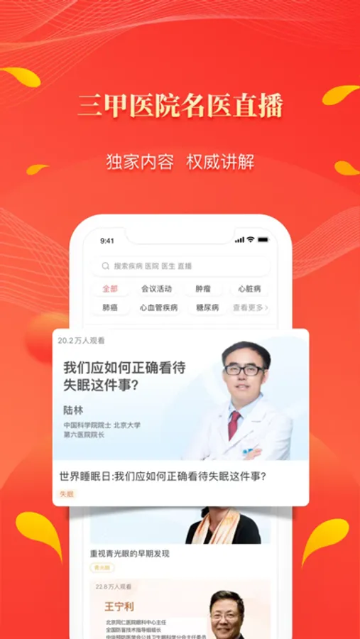 人民好医生APP定向邀请全国三甲医院知名医生做客直播间,与网友面对面,共同探讨健康疾病话题。各疾病领域专家就生活中经常遇到的疾病问题做出通俗易懂的解答。