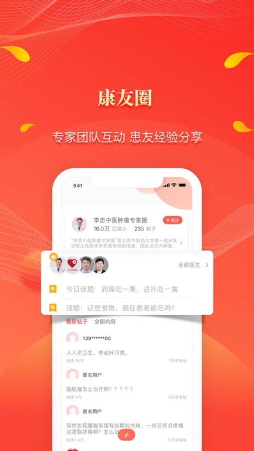 三甲公立医院专家带领医疗团队入驻,建立专家官方的医患交流平台。提供免费的健康咨询服务,连接同种疾病患友,分享彼此的经验感受。