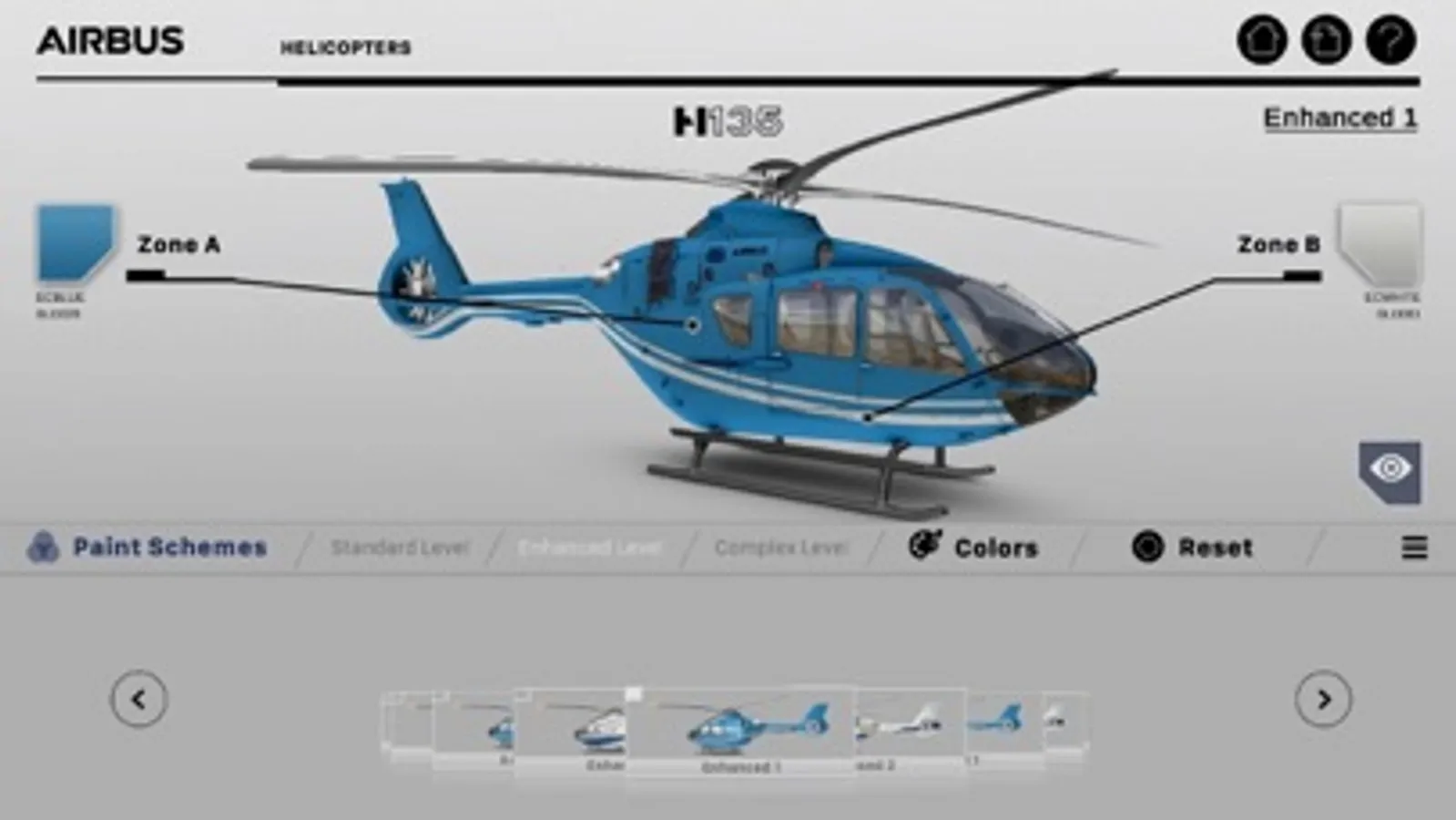 The Airbus Helicopters Paint Scheme application proposes predefined real paint schemes for the H120, H125, H130, H135 and H145 helicopters.