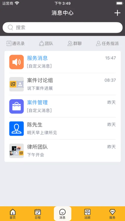 发布任务给团队成员非常高效,您可以点击发布任务选择成员名字或者拖动任务给该成员,您还可以对任务设置完成时间、提醒,以便高效告知任务接收人。 即时的通讯体验,这种即时聊天般的体验让办案更加快捷高效。直观的团队成员工作记录,你可以非常直观的了解你的团队成员工作成果,及时跟踪案件进展,督促案件分工有序的完成。