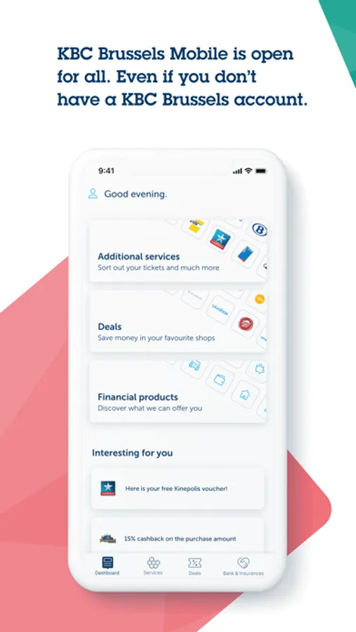 If you already have a current account with us, you can use our KBC Brussels Mobile app to the full. That includes access to a host of handy additional services. For instance, you can rent a shared bike, buy cinema and theme park tickets, pay for parking, order service vouchers, and much more besides. KBC Deals is another great feature you won’t want to miss if you'd like to earn cashback rewards at lots of local and national partners.