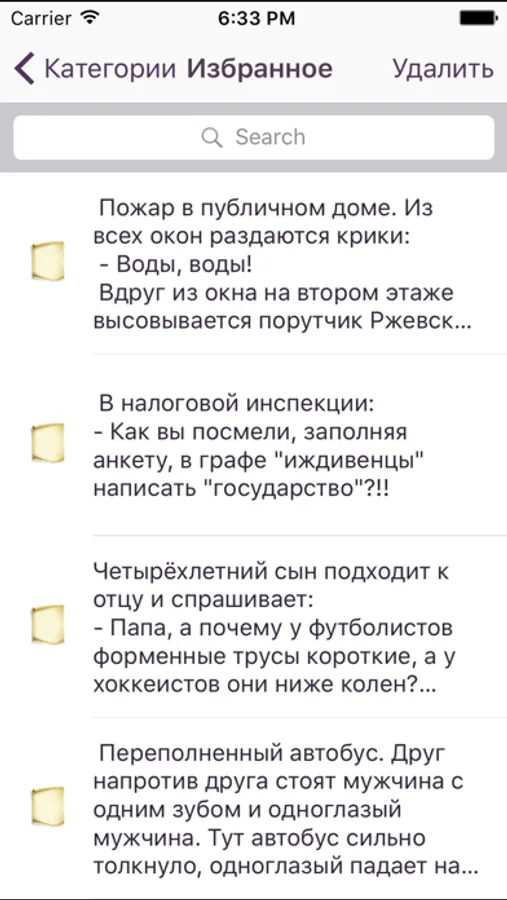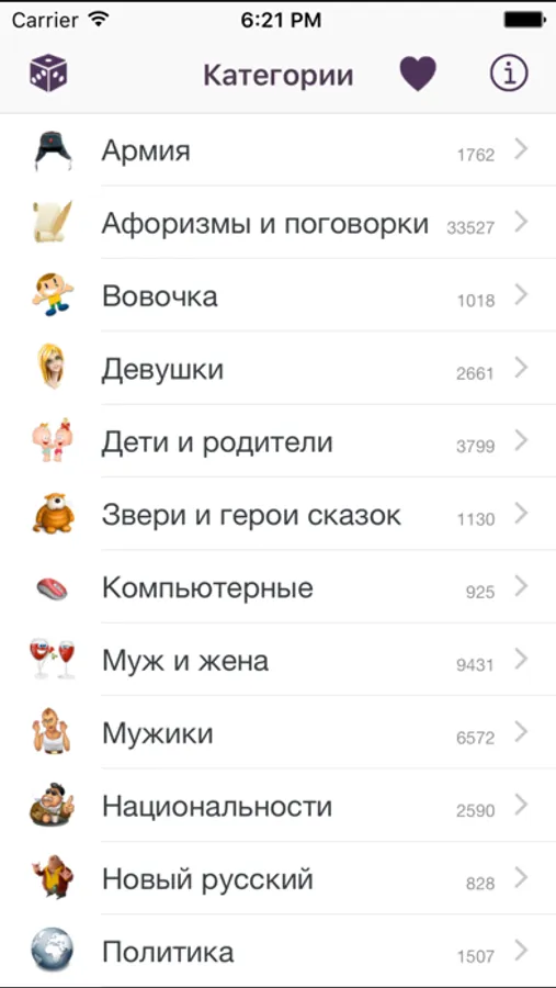 Более 128 000 анекдотов, смешных афоризмов и цитат. Для удобства каталог условно разбит на 23 категории. Есть возможность добавить понравившиеся анекдоты в избранное или поделиться с друзьями.
