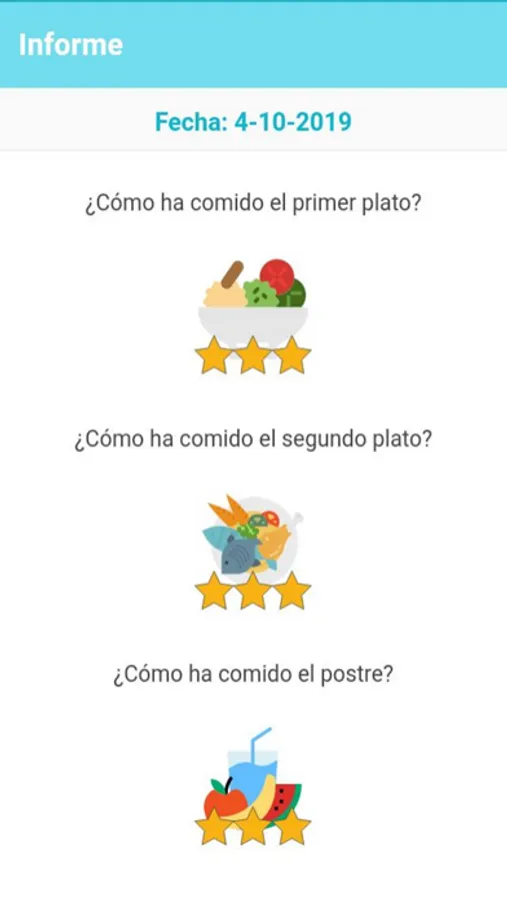 Tras una secuencia de pantallas, podréis observar cómo ha comido su hija o hijo, así como el comportamiento en el comedor y en las actividades de ocio y tiempo libre.