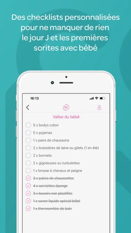 > Des checklists personnalisées pour ne manquer de rien le jour J et les premières sorties avec bébé : trousseau maternité pour maman, pour bébé, les premiers week-end de bébé (à la plage, en randonnée, …), la trousse de premiers secours, etc.