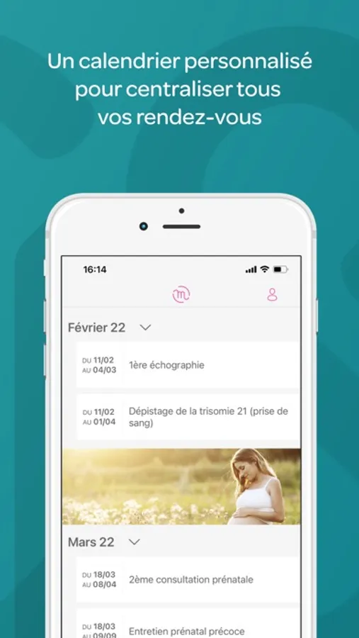 > Un calendrier de grossesse personnalisé : renseignez simplement votre date prévue d’accouchement et retrouvez en un clic votre calendrier interactif avec des rappels pour tous vos rendez-vous médicaux, les examens obligatoires de la grossesse et les démarches administratifs.