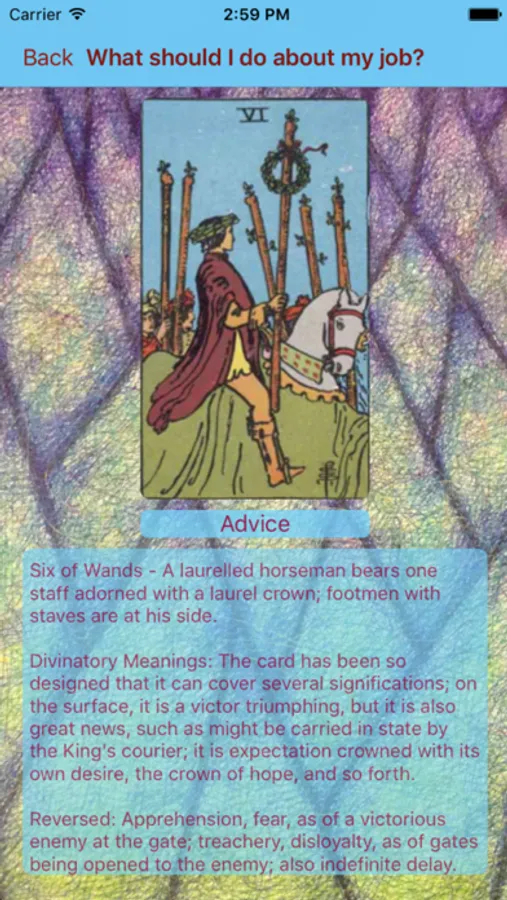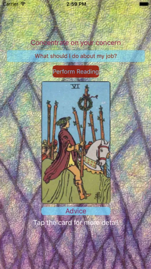 Tarot Card Reader Lite provides an easy and quick tarot card reading. When something is on your mind and you need a guide to what the cosmos has in store for you, you can use this app for an answer. Simply concentrate on your concern, write it down to focus if you like, then press the "Perform Reading" button. A tarot card generated by the universe will be shown. Tap the card for further information.