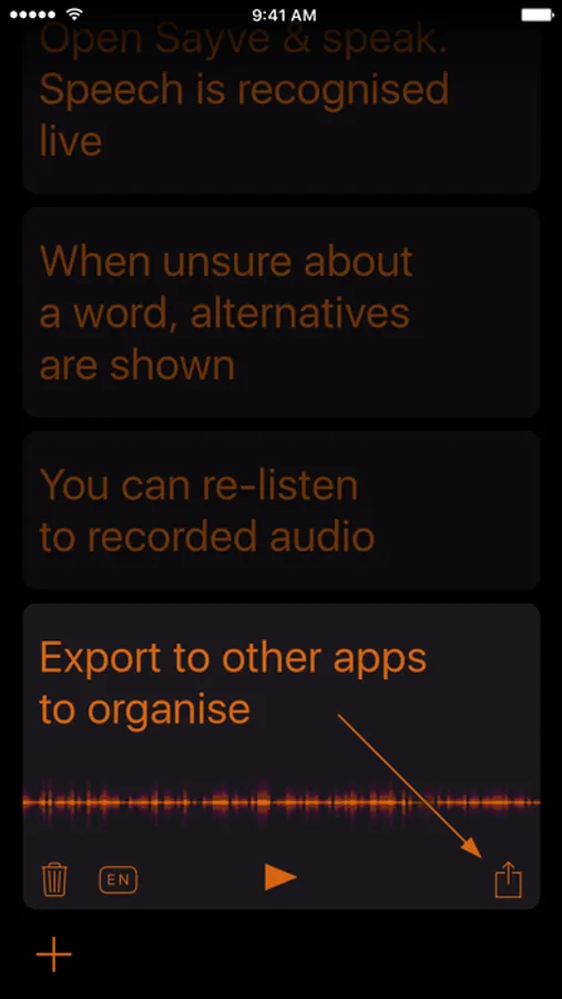 Sayve is not to store notes in organised way, but to quickly say and save stuff to deal with later. Once you have time to sort your thoughts, move them to Notes.app or somewhere else.