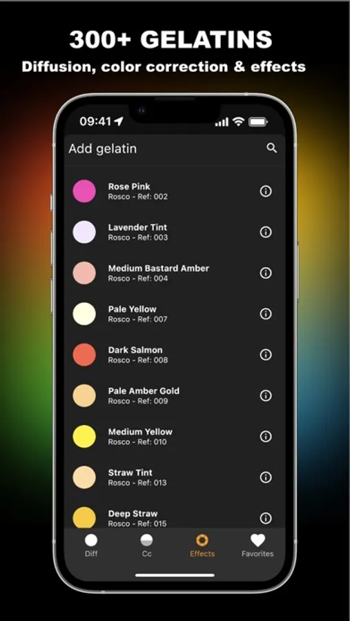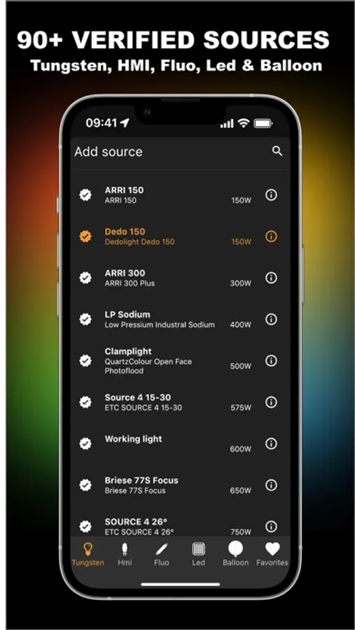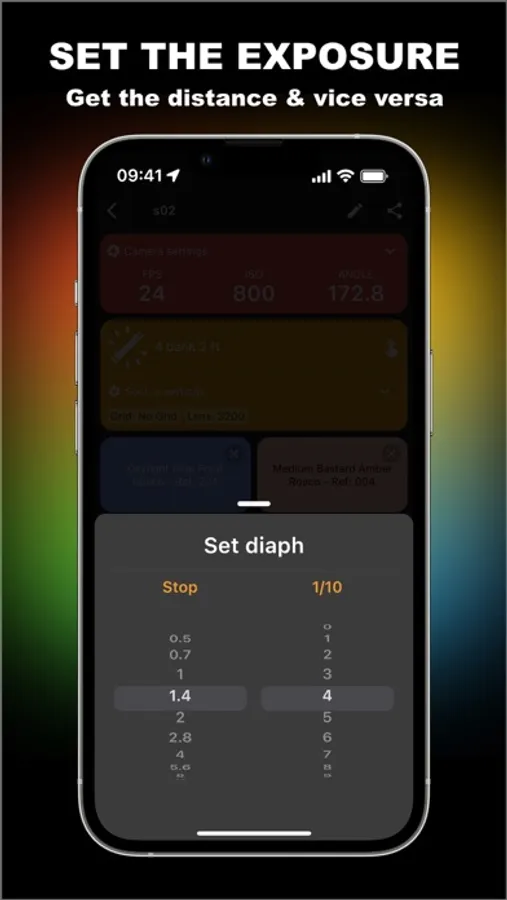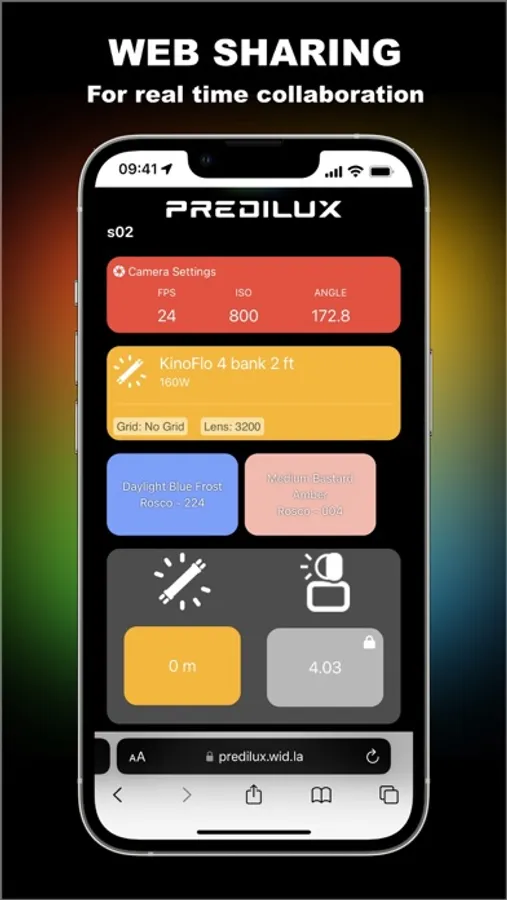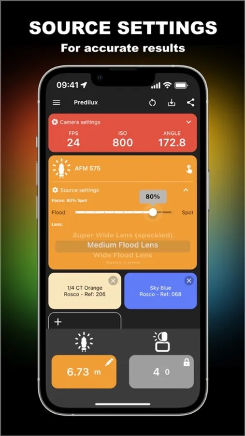 Predilux takes into account camera settings (FPS, ISO, Shutter), source settings (Focalization, Lens, Grid, etc.) and gels (Diffusion, CTO/CTB, CTS, +- Green, and dozen of effects).