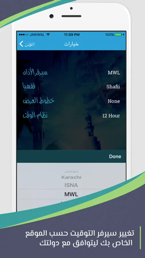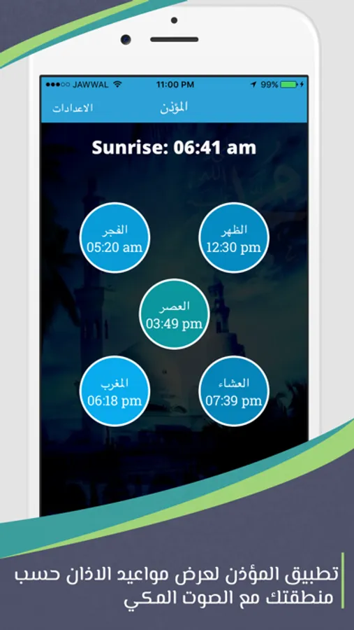 تطبيق المؤذن للايفون لعرض مواعيد الصلاة والتنبيه عند كل موعد للصلاوت الخمس على الايفون.