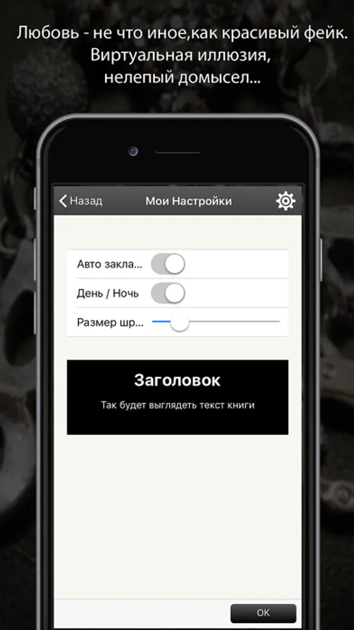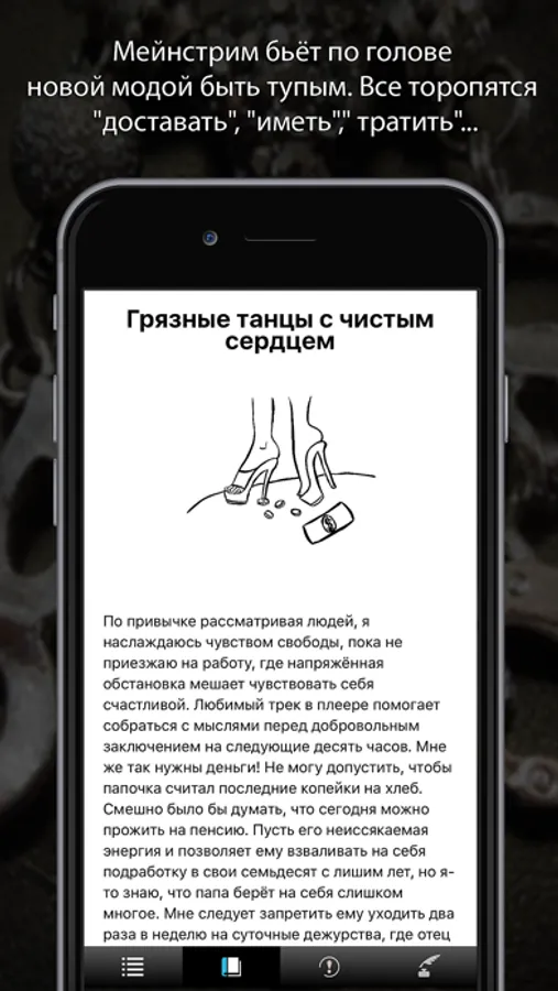 Приложение «50 оттенков грязи. Сердце на привязи» дополнено функцией Диктор, это позволяет читать книги вслух. Теперь книга доступна для незрячих и слабовидящих пользователей, а так же для людей с ограниченными возможностями. В настройках Диктора Вы сможете настроить тембр голоса и темп речи, а также увеличить или уменьшить/отключить громкость фоновой музыки.