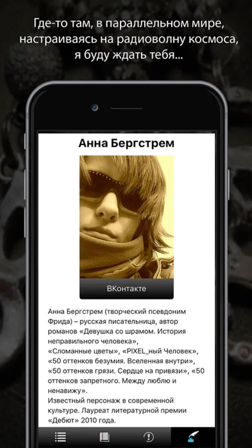 В этом приложении вы сможете читать эту книгу. А так же рассмотреть иллюстрации, сделанные автором.