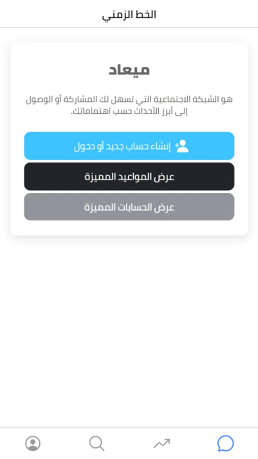 ميعاد هو شبكة اجتماعية تسهل لك مشاركة أو متابعة أبرز الأحداث والمواعيد حسب اهتماماتك.