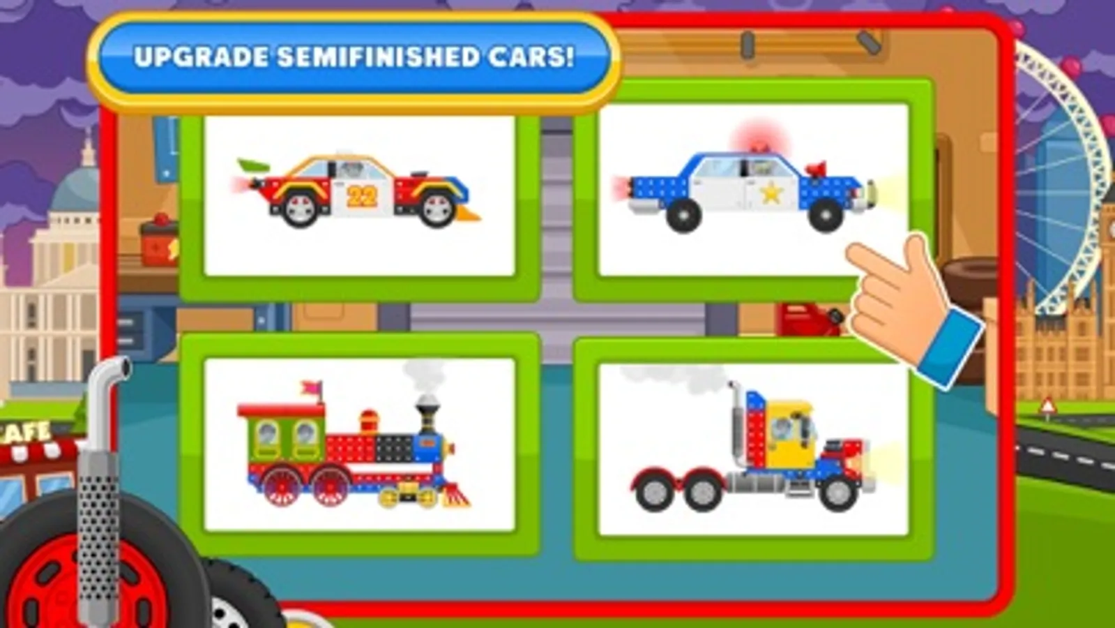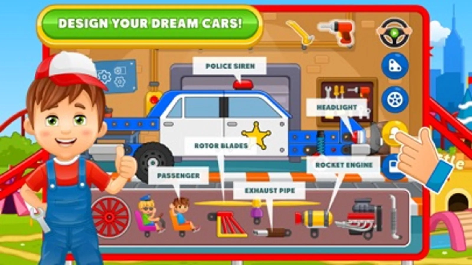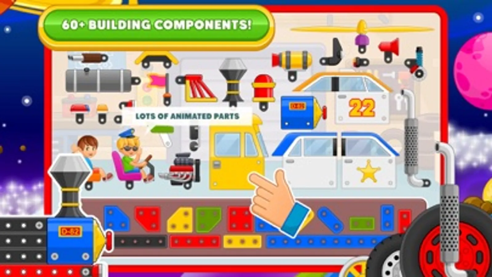 - Choose from a number of pre-built cars such as racecars, train, truck, police car, and etc.!