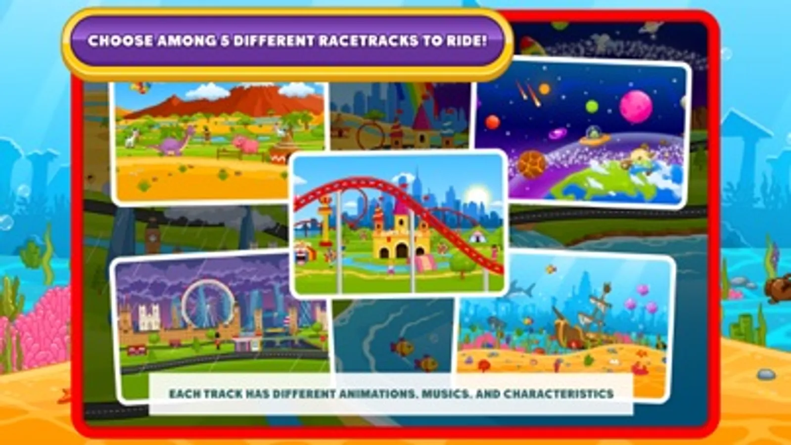 - Go under water, race through the jungles of Africa, make your way through space, enjoy the pre-historic times or jump around in the amusement park – to enjoy 5 different racing track options!