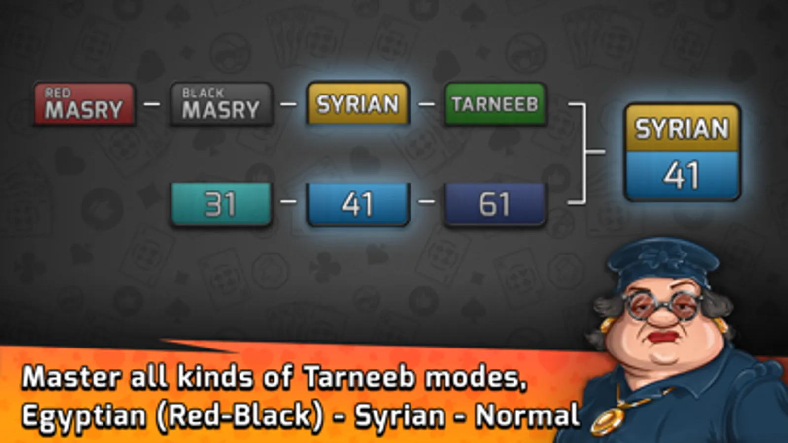 -Play Tarneeb with multiple score limits (31, 41 or 61) and multiple game modes (Egyptian (Red & Black, Syrian or Normal Tarneeb)