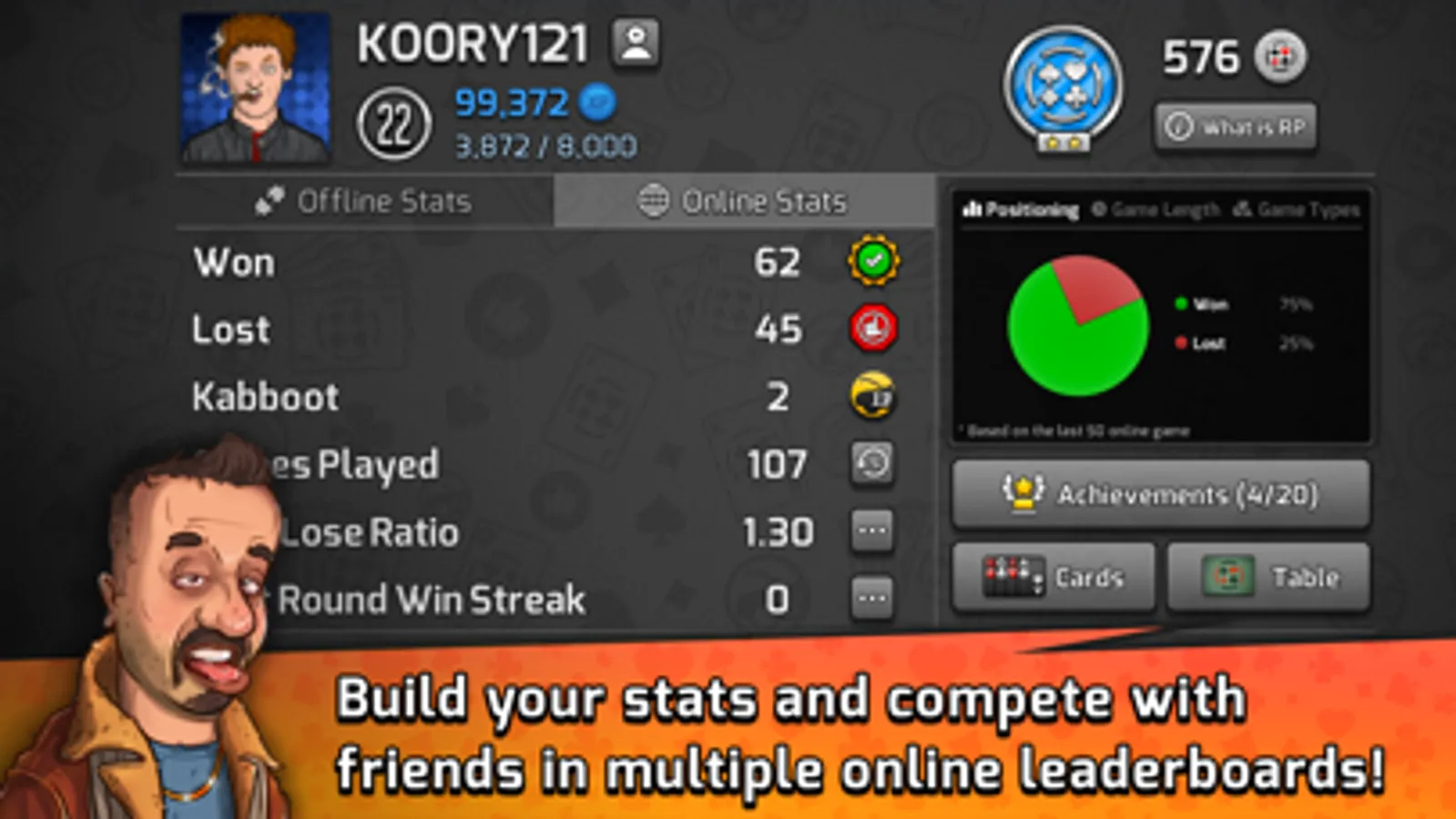 -Track your progress in Pocket Tarneeb through the Profile menu