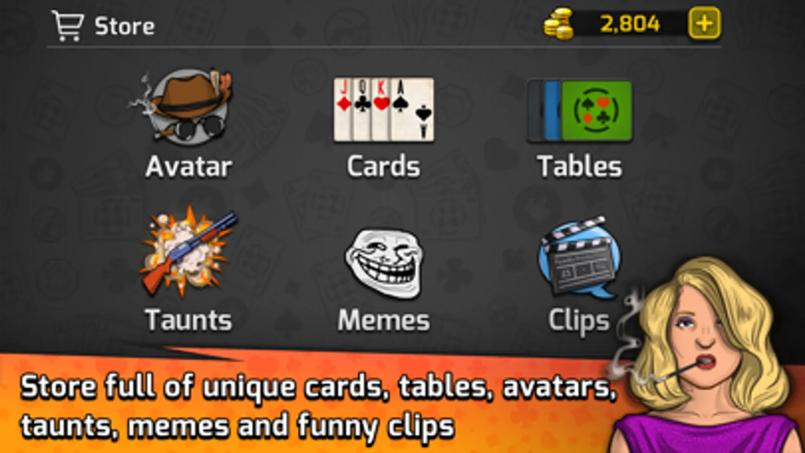 -Buy and collect a variety of creative card decks and backgrounds from the in-game store