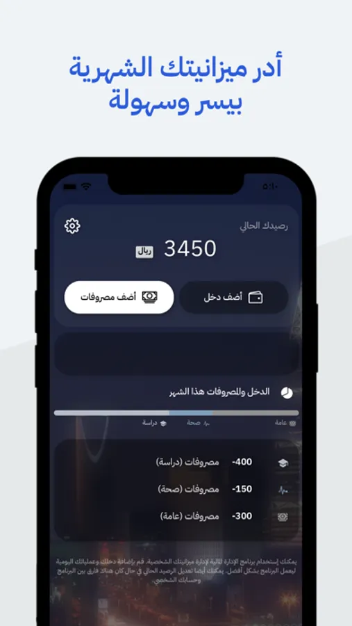 يحتوي أيضا على خدمة لإدارة الميزانية (المصروفات الشهرية)
