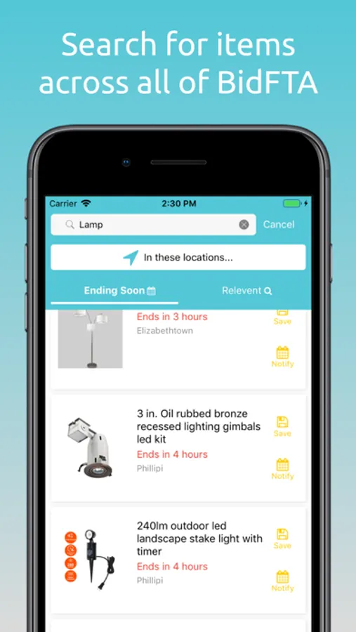 FTA Search includes a full text search engine for searching the entire database of items available on BidFTA. You can search, filter by location, and sort by relevancy or items ending soonest.