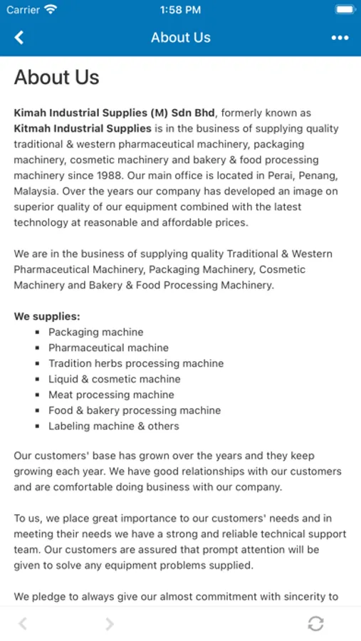 Kimah Industrial Supplies (M) Sdn Bhd, formerly known as Kitmah Industrial Supplies is in the business of supplying quality traditional & western pharmaceutical machinery, packaging machinery, cosmetic machinery and bakery & food processing machinery since 1988. Our main office is located in Perai, Penang, Malaysia. Over the years our company has developed an image on superior quality of our equipment combined with the latest technology at reasonable and affordable prices.
